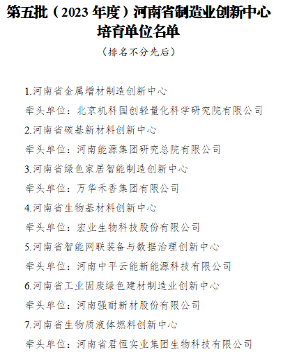 通知显示,有7家单位入选,分别为:北京机科国创轻量化科学研究院有限公司牵头的河南省金属增材制造创新中心、河南能源集团研究总院有限公司牵头的河南省碳基新材料创新中心、万华禾香集团有限公司牵头的河南省绿色家居智能制造创新中心、宏业生物科技股份有限公司牵头的河南省生物基材料创新中心、河南中平云能新能源科技有限公司牵头的河南省智能网联装备与数据治理创新中心、河南强耐新材股份有限公司牵头的河南省工业固废绿色建材制造业创新中心、河南省君恒实业集团生物科技有限公司牵头的河南省生物质液体燃料创新中心。