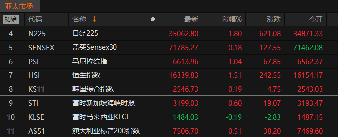 据Choice金融终端数据,1月11日午间,亚太市场主要股指普涨。截至北京时间13时00分,日经225指数涨1.80%,报35062.80点;印度Sensex30指数涨0.18%,报71785.27点;韩国综合指数涨0.19%,报2546.73点;富时马来西亚KLCI指数跌0.19%,报1484.03点;澳大利亚标普200指数涨0.51%,报7506.70点。